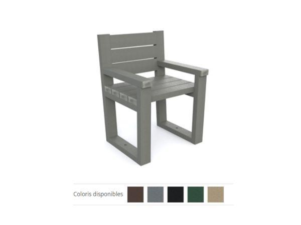 - Assise et dossier composés de lattes de section 5 x 12 cm - Accoudoirs - Fixation par 3 goujons d'ancrage (en option) - Poids : 65 kg - Livré monté - Repose-pieds en option (nous consulter) - Coloris proposés : marron, gris, noir, vert (beige en option).